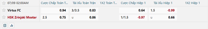 Tip kèo Châu Á hiệp 1 Virtus vs HSK Zrinjski