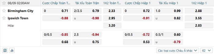 - Dự đoán tỷ số hiệp 1: Birmingham 0 – 0 Ipswich Town