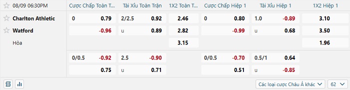 Tip kèo Châu Á hiệp 1 Charlton vs Watford