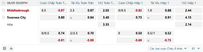 Tip kèo Châu Á full trận Middlesbrough vs Swansea