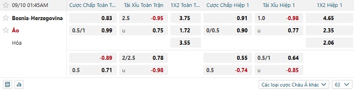 Tip kèo Châu Á hiệp 1 Bosnia vs Áo