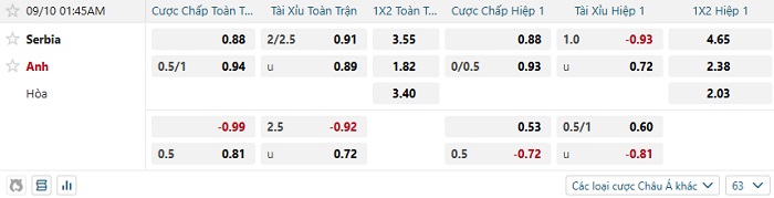 Tip kèo Châu Á hiệp 1 Serbia vs Anh