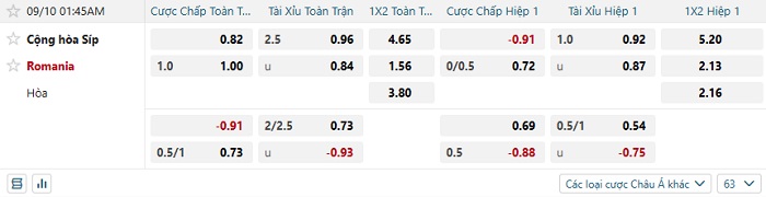 Tip kèo Châu Á hiệp 1 Síp vs Romania