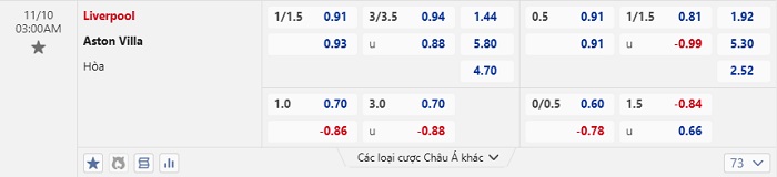 Tip kèo Châu Á full trận Liverpool vs Aston Villa
