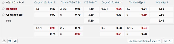 Tip kèo Châu Á hiệp 1 Romania vs CH Síp