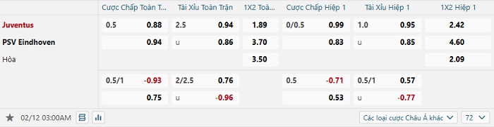 Tip kèo Châu Á full trận Juventus vs PSV Eindhoven