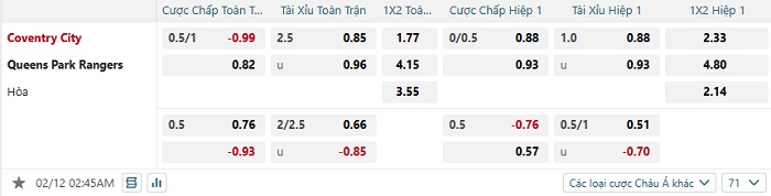 Tip kèo Châu Á hiệp 1 Coventry vs QPR