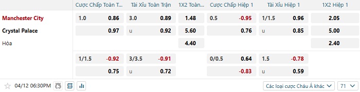 Tip kèo Châu Á hiệp 1 Man City vs Crystal Palace