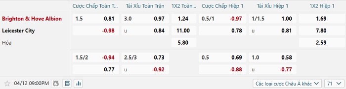 Tip kèo Châu Á hiệp 1 Brighton vs Leicester