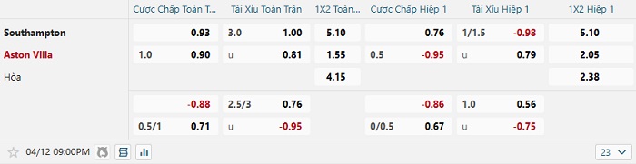 Tip kèo Châu Á hiệp 1 Southampton vs Aston Villa