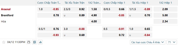 Tip kèo Châu Á hiệp 1 Arsenal vs Brentford