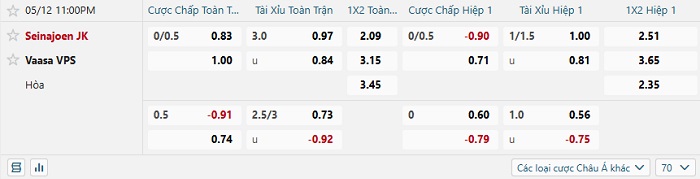 • Tip kèo cá cược Châu Á hiệp 1: Chọn Vaasa +1/4