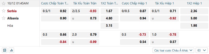 Tip kèo Châu Á hiệp 1 Serbia vs Albania