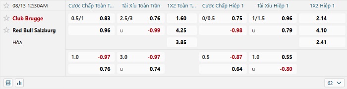 Tip kèo Châu Á hiệp 1 Club Brugge vs Salzburg