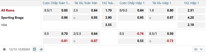 Tip kèo Châu Á hiệp 1 Roma vs Sporting Braga