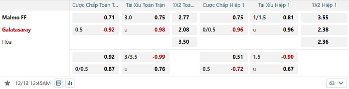Tip kèo Châu Á hiệp 1 Malmo vs Galatasaray