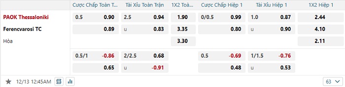 Tip kèo Châu Á full trận PAOK vs Ferencvarosi
