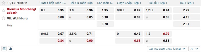 Tip kèo Châu Á hiệp 1 Monchengladbach vs Wolfsburg