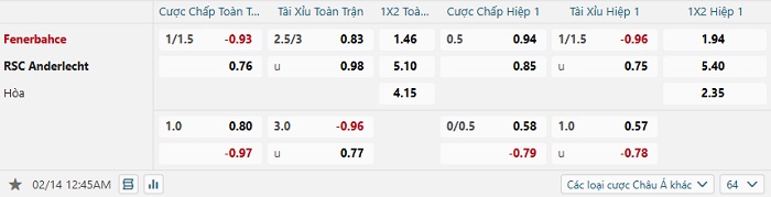 Tip kèo Châu Á hiệp 1 Fenerbahce vs Anderlecht