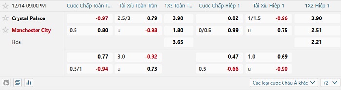Tip kèo Châu Á full trận Crystal Palace vs Man City