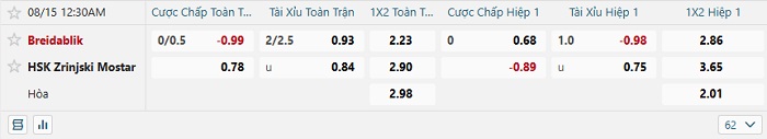 Tip kèo Châu Á hiệp 1 Breidablik vs Zrinjski Mostar