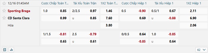 • Dự đoán tỷ số hiệp 1: Sporting Braga 1 – 0 Santa Clara