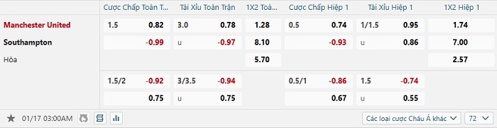 Tip kèo Châu Á hiệp 1 Man United vs Southampton