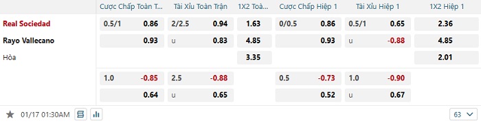 Tip kèo Châu Á full trận Real Sociedad vs Rayo Vallecano
