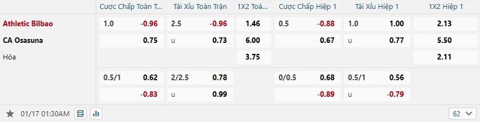 Tip kèo Châu Á hiệp 1 Bilbao vs Osasuna
