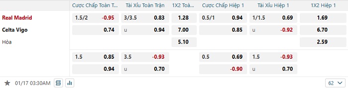Tip kèo Châu Á hiệp 1 Real Madrid vs Celta Vigo