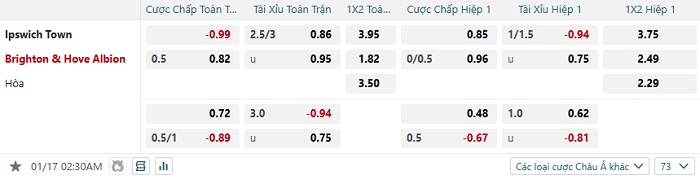 Tip kèo Châu Á hiệp 1 Ipswich vs Brighton