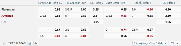 Tip kèo Châu Á hiệp 1 Fiorentina vs Juventus