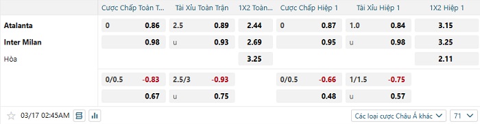 Tip kèo Châu Á hiệp 1 Atalanta vs Inter