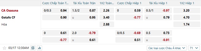 Tip kèo Châu Á hiệp 1 Osasuna vs Getafe