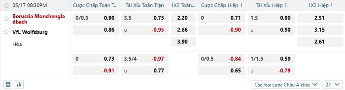 Tip kèo Châu Á hiệp 1 M’gladbach vs Wolfsburg