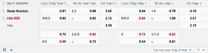 Tip kèo Châu Á hiệp 1 Brest vs Lille