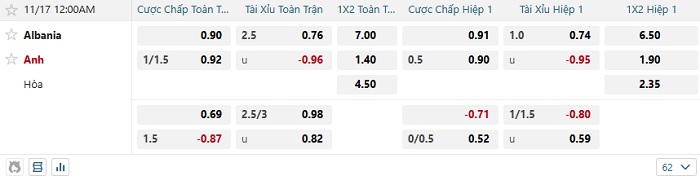 Tip kèo Châu Á hiệp 1 Albania vs Anh