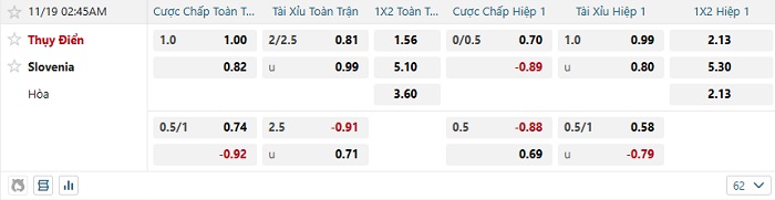 Tip kèo Châu Á full trận Thụy Điển vs Slovenia