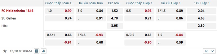Tip kèo Châu Á full trận Heidenheim vs St. Gallen