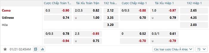 Tip kèo Châu Á hiệp 1 Como vs Udinese