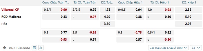 Tip kèo Châu Á hiệp 1 Villarreal vs Mallorca