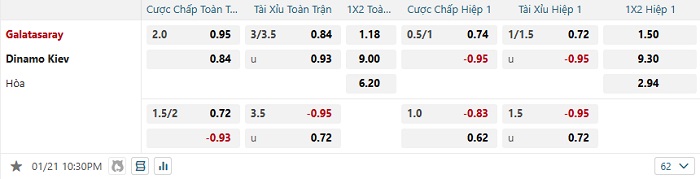 Tip kèo Châu Á hiệp 1 Galatasaray vs Dinamo Kiev