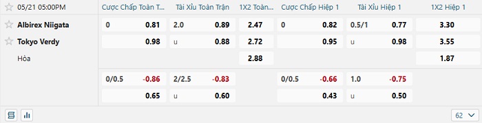 Tip kèo Châu Á hiệp 1 Albirex Niigata vs Tokyo Verdy