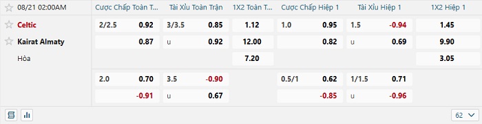 Tip kèo Châu Á hiệp 1 Celtic vs Kairat Almaty