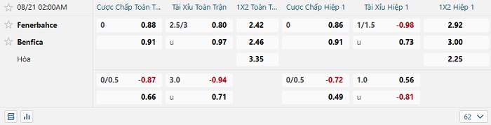 Tip kèo Châu Á hiệp 1 Fenerbahce vs Benfica
