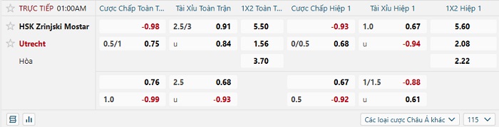 Tip kèo Châu Á hiệp 1 Zrinjski Mostar vs Utrecht