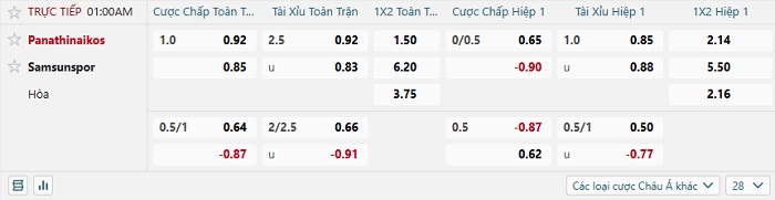 Tip kèo Châu Á full trận Panathinaikos vs Samsunspor