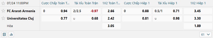 Tip kèo Châu Á full trận Ararat Armenia vs Universitatea Cluj