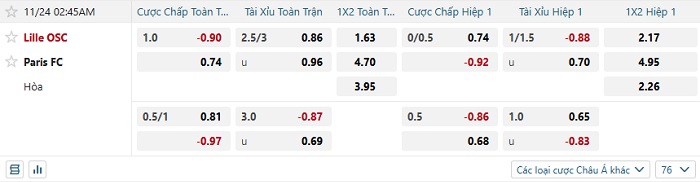 Tip kèo Châu Á hiệp 1 Lille vs Paris FC