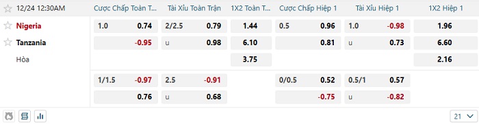 Tip kèo Châu Á hiệp 1 Nigeria vs Tanzania